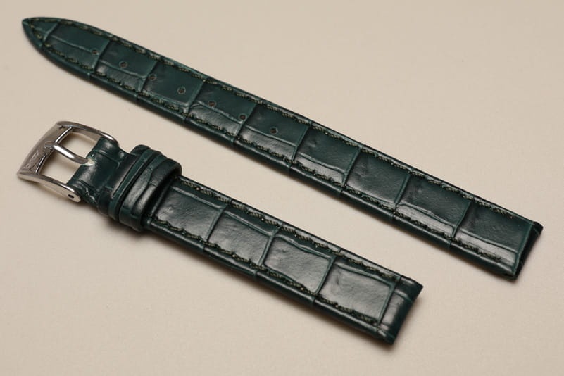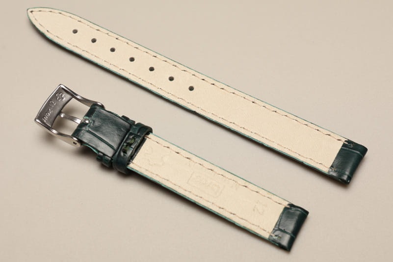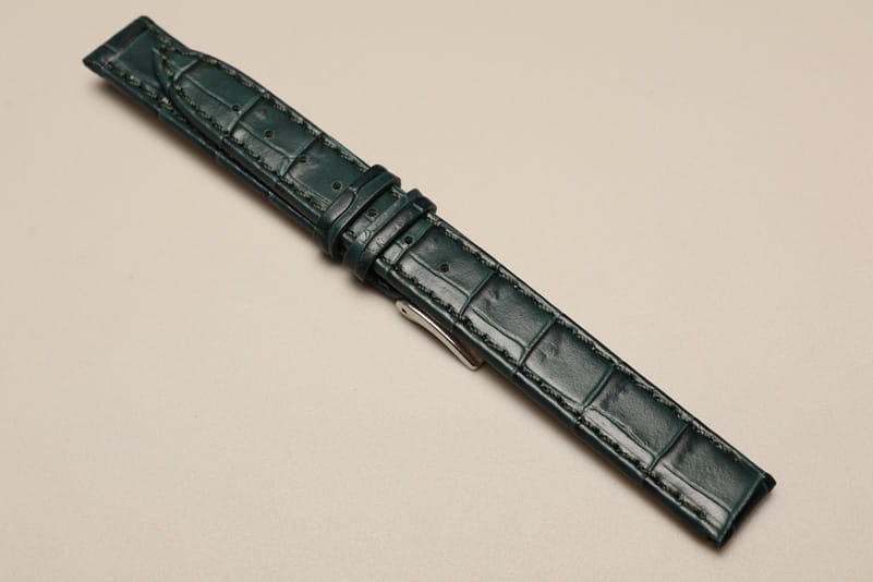 Elegancki, półmatowy pasek tłoczony na wzór skóry aligatora. W kolorze szarym, przeszyty nicią w kolorze paska. Podwójna szlufka, stalowa klamerka. Równoległy fason paska pozwala przełożyć dotychczasową, oryginalną (np. z logo zegarka) klamerkę o szerokości 12mm