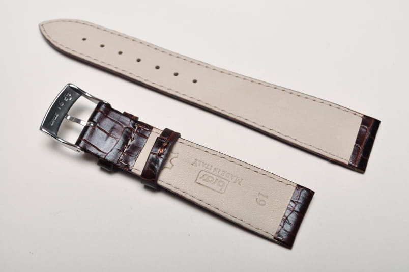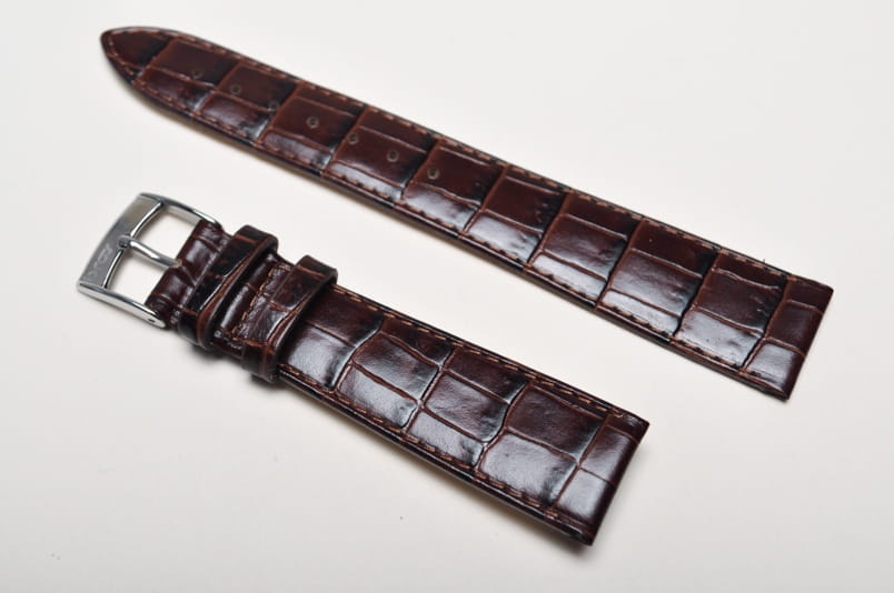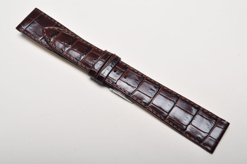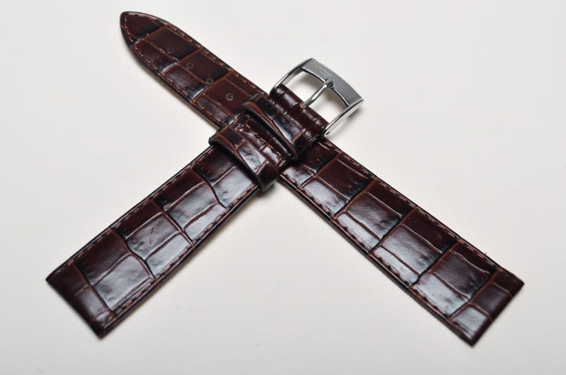 Wykonany ze skóry naturalnej na wzór skóry aligatora. Delikatny połysk Obszyty brązową nicią. Podwójna szlufka. Stalowa klamerka. Grubość paska 2,5 mm. Pasek do markowych zegarków, za rozsądną cenę, z możliwością wymiany klamerki na oryginalną.