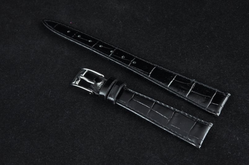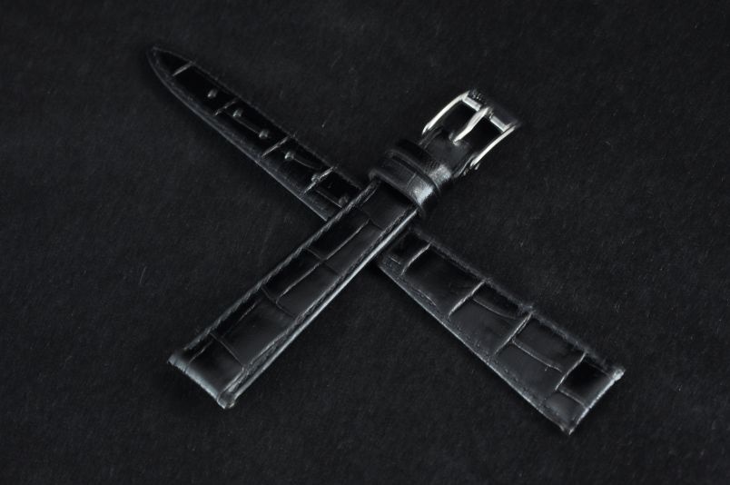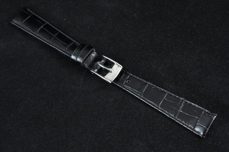 Uszyty z naturalnej skóry, imitacja skóry aligatora. W kolorze czarnym, błyszczący. Przeszyty nicią w kolorze paska. Podwójna szlufka, stalowa klamerka.