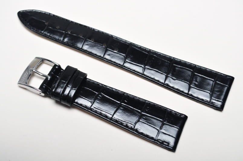 Wykonany ze skóry naturalnej na wzór skóry aligatora. Z delikatnym połyskiem. Obszyty czarną nicią. Klamerka 16 mm. Podwójna szlufka. Stalowa klamerka w kolorze żółtym. Grubość paska 2,5 mm. Pasek do markowych zegarków, za rozsądną cenę, z możliwością wymiany klamerki na oryginalną.