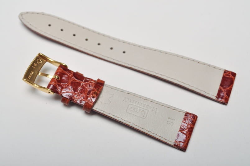 Pasek włoskiej firmy Bros. Uszyty z naturalnej skóry tłoczonej na wzór skóry krokodyla. Przeszycie w kolorze paska. Miękki, cienki i delikatny. Lakierowany, z połyskiem. Podwójna szlufka. Stalowa klamerka. Idealny do klasycznych, płaskich zegarków.