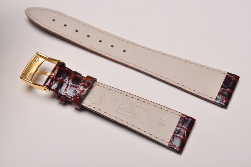 Pasek włoskiej firmy Bros. Uszyty z naturalnej skóry tłoczonej na wzór skóry krokodyla. Przeszycie w kolorze paska. Miękki, cienki i delikatny. Lakierowany, z połyskiem. Podwójna szlufka. Stalowa klamerka. Idealny do klasycznych, płaskich zegarków.