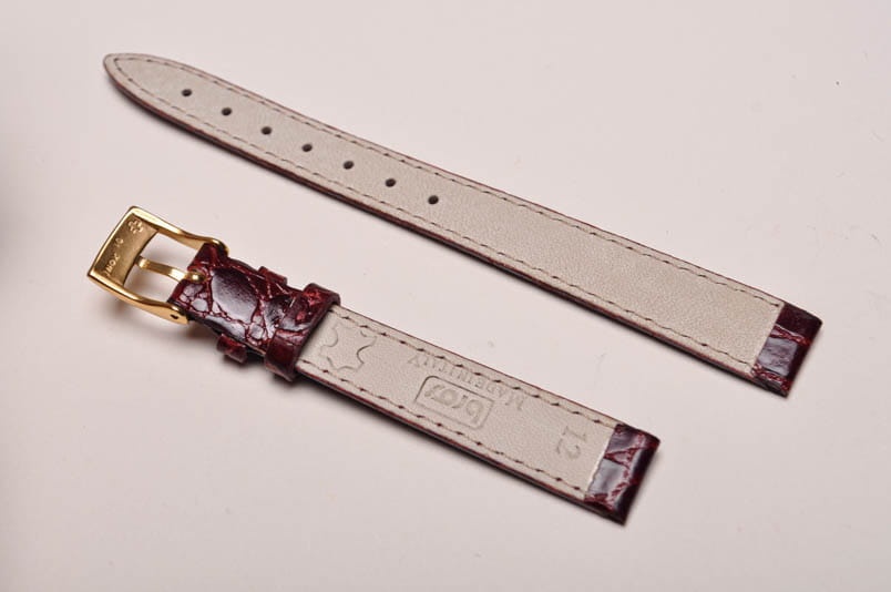 Pasek włoskiej firmy Bros. Uszyty z naturalnej skóry tłoczonej na wzór skóry krokodyla. Przeszycie w kolorze paska. Miękki, cienki i delikatny. Lakierowany, z połyskiem. Podwójna szlufka. Stalowa klamerka. Idealny do klasycznych zegarków.