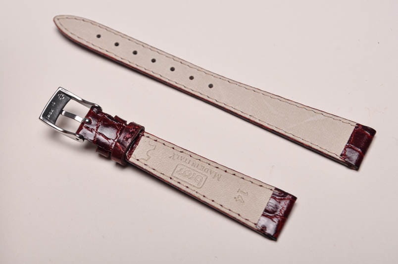 Pasek włoskiej firmy Bros. Uszyty z naturalnej skóry tłoczonej na wzór skóry krokodyla. Przeszycie w kolorze paska. Miękki, cienki i delikatny. Lakierowany, z połyskiem. Podwójna szlufka. Stalowa klamerka. Idealny do klasycznych zegarków.