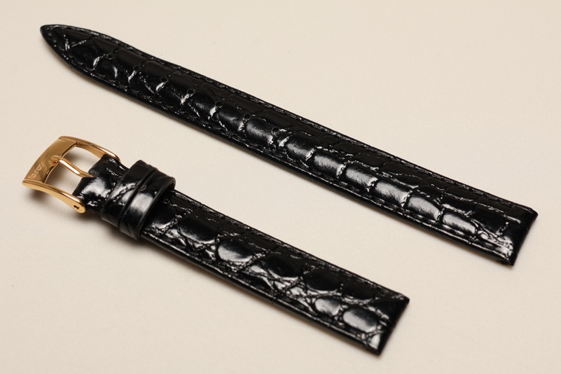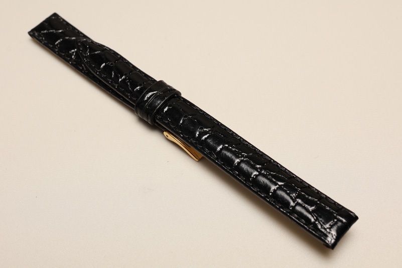 Uszyty z naturalnej skóry, imitacja skóry krokodyla. W kolorze czarnym, blyszczący. Przeszyty nicią w kolorze paska. Podwójna szlufka, stalowa klamerka.