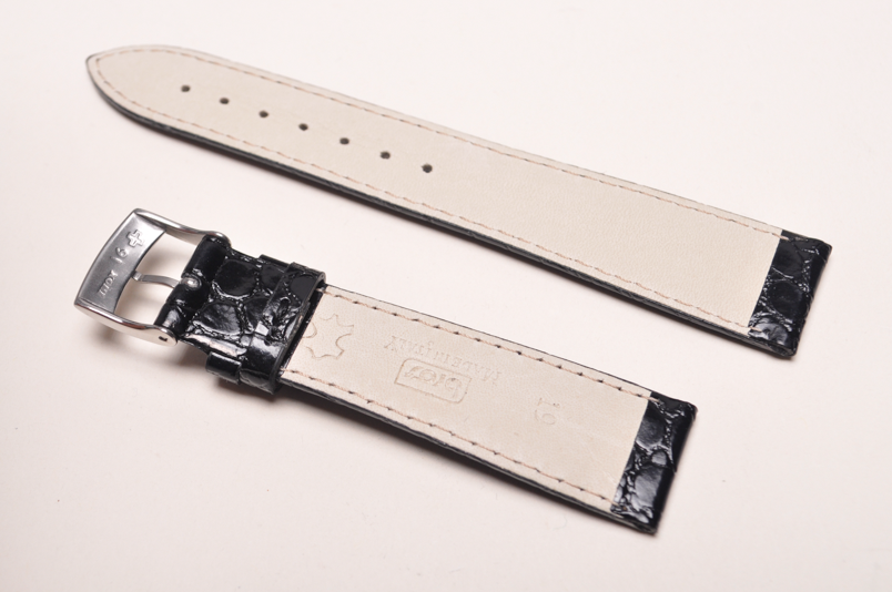 Wykonany ze skóry naturalnej na wzór skóry krokodyla. Delikatny połysk Obszyty czarną nicią. Klamerka 16 mm. Podwójna szlufka. Stalowa klamerka w kolorze złotym. Grubość paska 2,5 mm. Pasek do markowych zegarków, za rozsądną cenę, z możliwością wymiany klamerki na oryginalną.