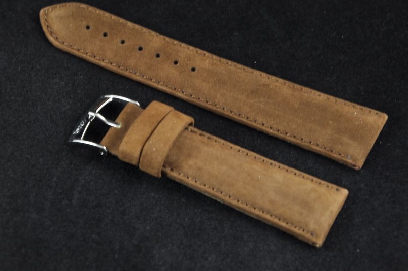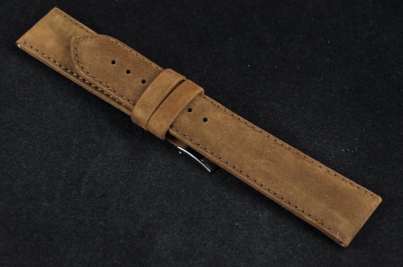 Do zegarków z mocowaniem 24mm. Uszyty z naturalnej skóry typu nubuk. Pogrubiony do 4mm. Przeszyty brązową nicią. Podwójna szlufka, stalowa klamerka.