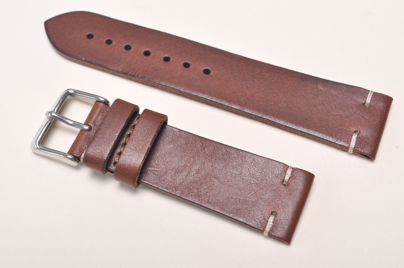 Wykonany z jednego kawałka naturalnej skóry. Klejony, gładki, ozdobne przeszycia przy mocowaniu. Miękki, 3mm grubości. Wykończenie matowe. Dwie szlufki, stalowa klamerka z logo.