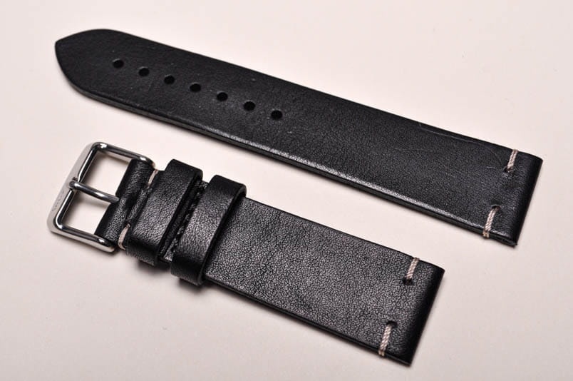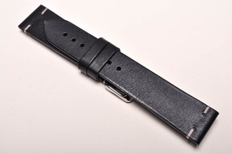 Wykonany z jednego kawałka naturalnej skóry. Klejony, gładki, ozdobne przeszycia przy mocowaniu. Miękki, 3mm grubości. Wykończenie matowe. Dwie szlufki, stalowa klamerka z logo.