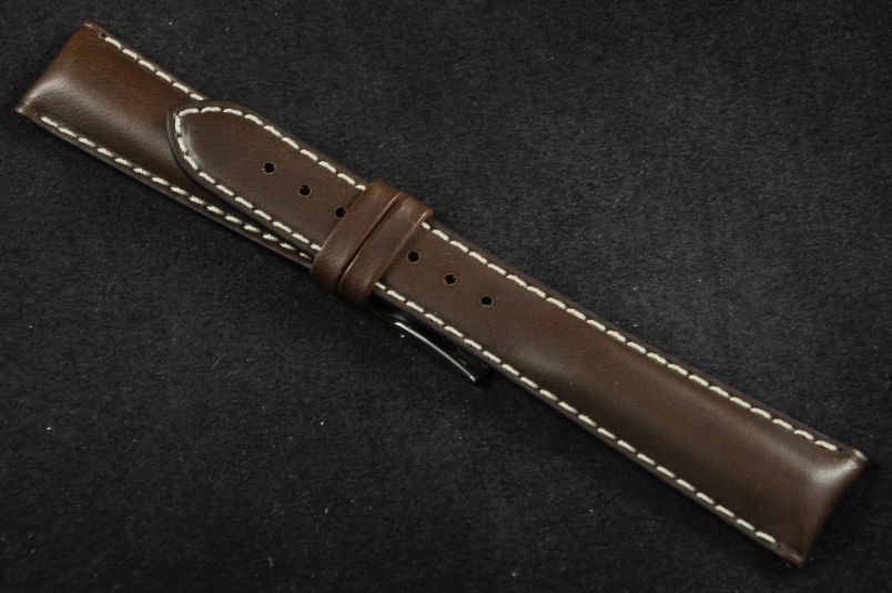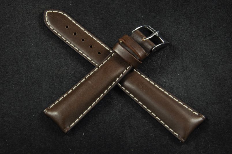 Do zegarków z mocowaniem 20mm. Uszyty z naturalnej, gładkiej skóry, matowe wykończenie. Przeszyty grubszą, białą nicią. Pasek pogrubiany przy zegarku do 6mm, dalej pocieniany do 3mm. Podwójna szlufka, stalowa klamerka. Szlachetny fason do markowych zegarków o sportowym charakterze.