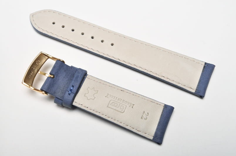 Do zegarków z mocowaniem 22mm. Uszyty z naturalnej skóry typu nubuk. Matowy i miły w dotyku. Pogrubiony do 4,5mm, dalej cieniowany do 3,5mm. Przeszyty nicią w kolorze paska. Brzegi paska malowane. Podwójna szlufka, stalowa klamerka.