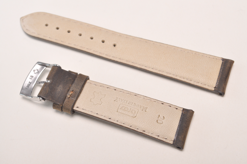 Do zegarków z mocowaniem 20mm. Uszyty z naturalnej skóry typu nubuk - specjalna postarzana skóra. Matowy i miły w dotyku. Pogrubiony do 4,5mm, dalej cieniowany do 3,5mm. Przeszyty nicią w kolorze paska. Brzegi paska malowane. Podwójna szlufka, stalowa klamerka.