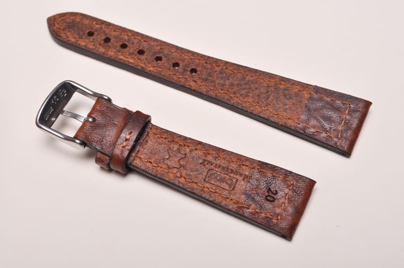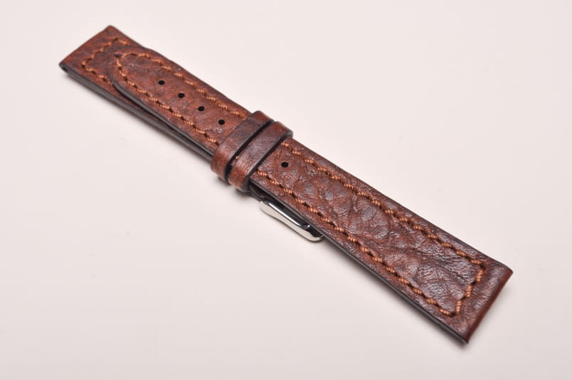Do zegarków z mocowaniem 22mm. Uszyty z naturalnej byczej skóry. Charakterystyczna faktura. Płaski, grubość 4,0mm przy zegarku do 3,0mm na końcu. Wyjątkowo miękki. Przeszyty nicią w kolorze paska. Podwójna szlufka, stalowa klamerka.