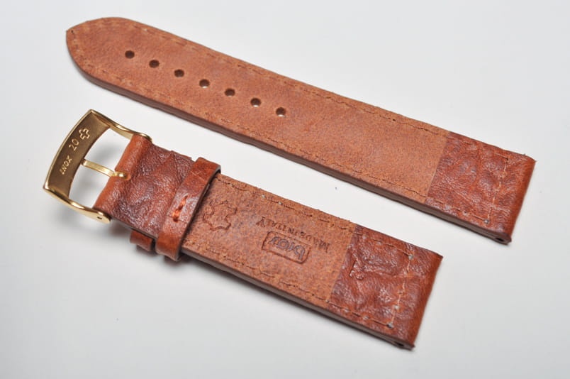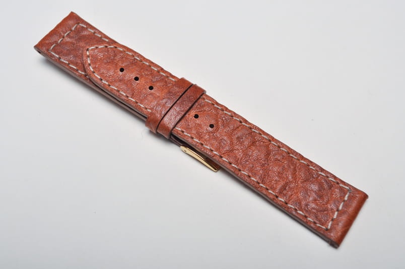 Do zegarków z mocowaniem 22mm. Uszyty z naturalnej byczej skóry. Charakterystyczna faktura. Płaski, grubość 4,0mm przy zegarku do 3,0mm na końcu. Wyjątkowo miękki. Przeszyty jasną nicią. Podwójna szlufka, stalowa klamerka.
