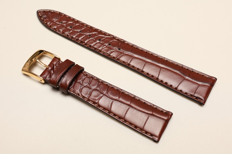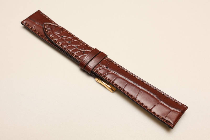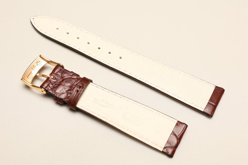 Pasek włoskiej firmy Bros, uszyty z oryginalnej skóry aligatora. Cienki, grubość od 3,20mm przy zegarku do 2,20mm na końcu. Przeszyty nicią pod kolor, wykończenie matowe.Podwójna szlufka.