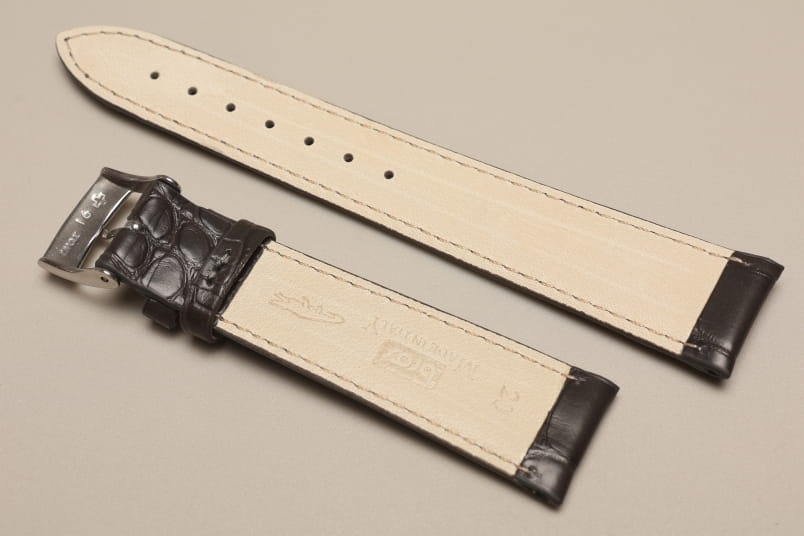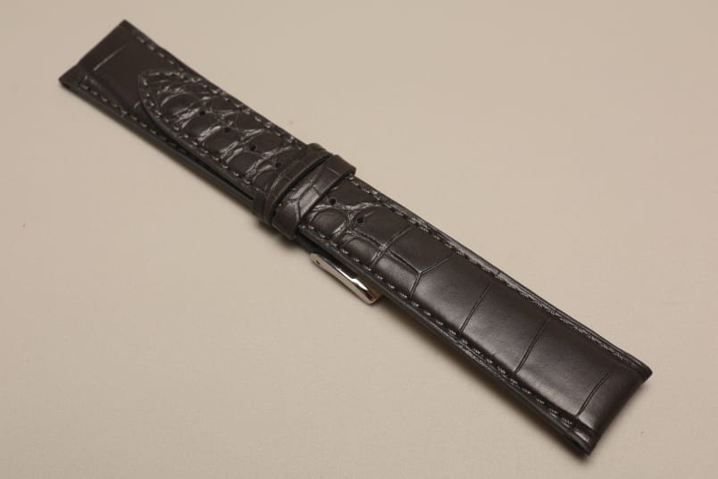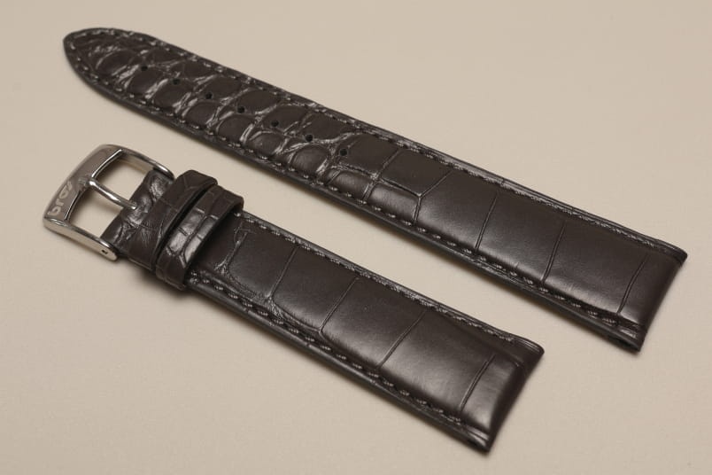 Pasek włoskiej firmy Bros, uszyty z oryginalnej skóry aligatora. Cienki, grubość od 3,20mm przy zegarku do 2,20mm na końcu. Przeszyty nicią pod kolor, wykończenie matowe.