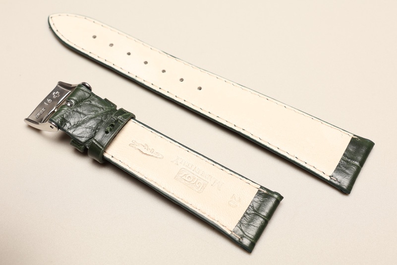 Pasek włoskiej firmy Bros, uszyty z oryginalnej skóry aligatora. Cienki, grubość od 3,20mm przy zegarku do 2,20mm na końcu. Przeszyty nicią pod kolor, wykończenie matowe. Podwójna szlufka. Elegancki pasek do markowych, klasycznych zegarków dostępny w szerokiej gamie pięknych kolorów.