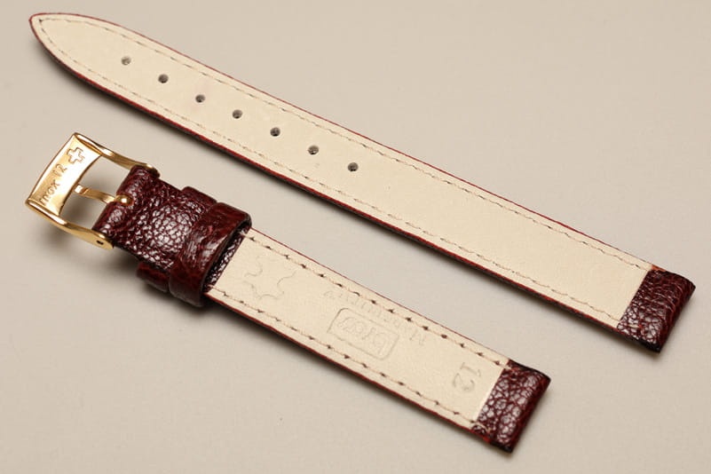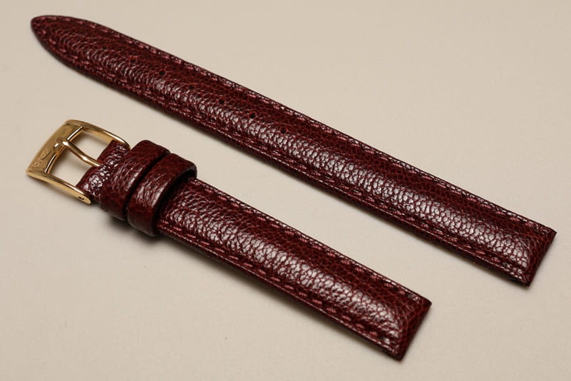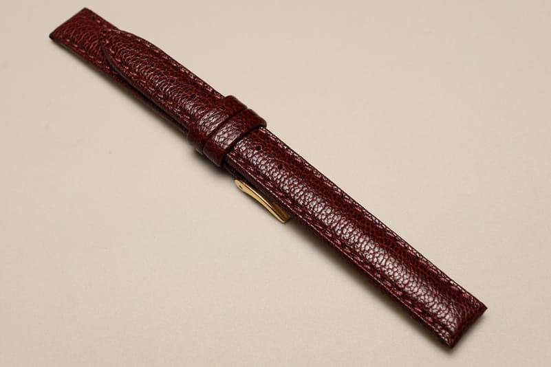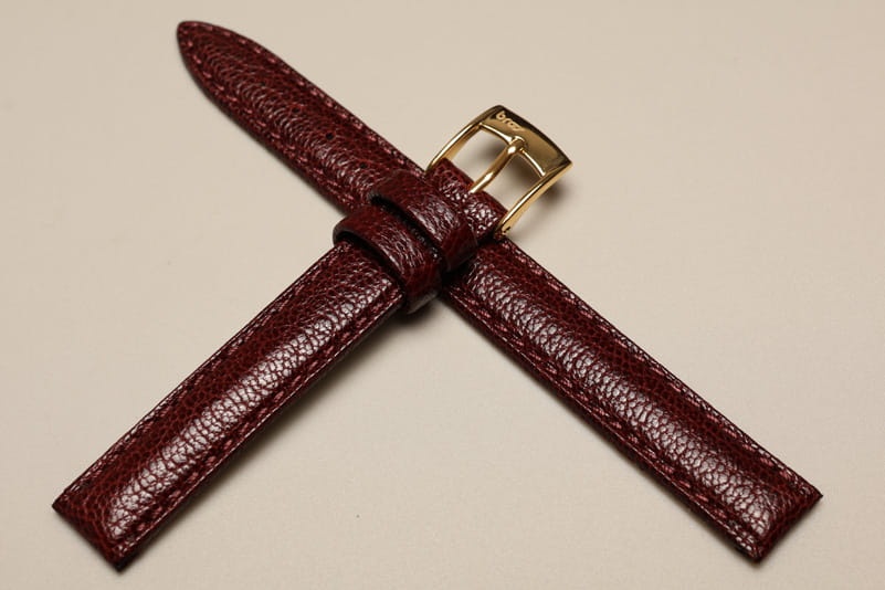 Oryginalny pasek włoskiej firmy Bros. Wykonany z naturalnej skóry o delikatnie marszczonej fakturze, z połyskiem. Bardzo miękki, przeszywany nicią w kolorze paska. Pogrubiany przy zegarku do 3,7mm, przy zapięciu 3,0mm grubości. Podwójna szlufka, stalowa klamerka. Pięknie wykończony, klasyczny, elegancki pasek