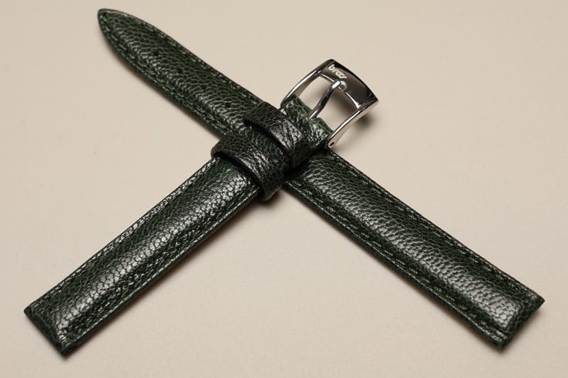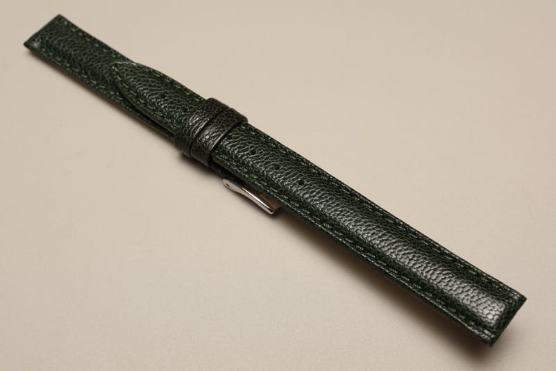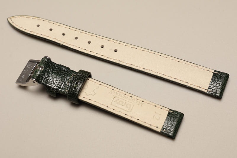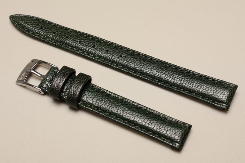 Oryginalny pasek włoskiej firmy Bros. Wykonany z naturalnej skóry o delikatnie marszczonej fakturze, z połyskiem. Bardzo miękki, przeszywany nicią w kolorze paska. Pogrubiany przy zegarku do 3,7mm, przy zapięciu 3,0mm grubości. Podwójna szlufka, stalowa klamerka. Pięknie wykończony, klasyczny, elegancki pasek.