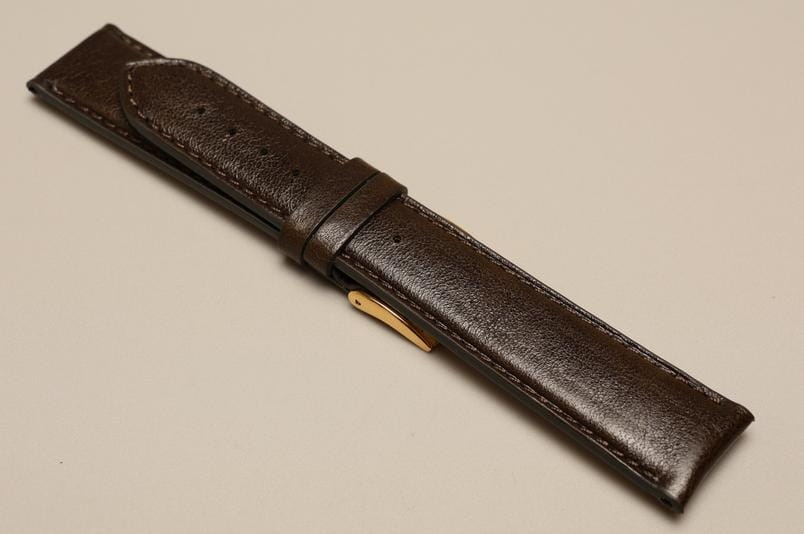Oryginalny pasek włoskiej firmy Bros. Wykonany z naturalnej skóry o fakturze skóry koziej, z połyskiem. Bardzo miękki, przeszywany nicią w kolorze paska. Pogrubiany przy zegarku do 4,2mm, przy zapięciu 2,8mm grubości. Podwójna szlufka, stalowa klamerka. Pięknie wykończony, klasyczny, elegancki pasek