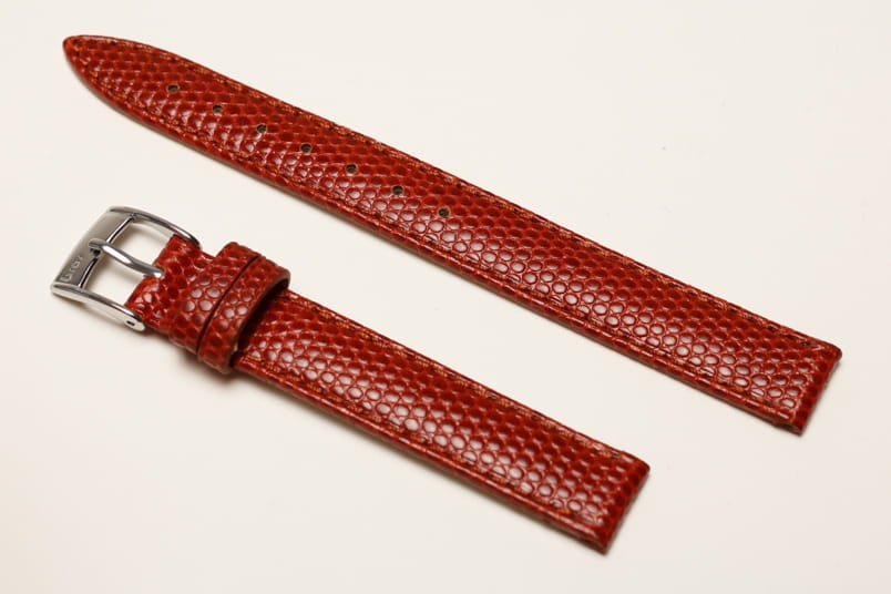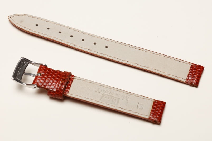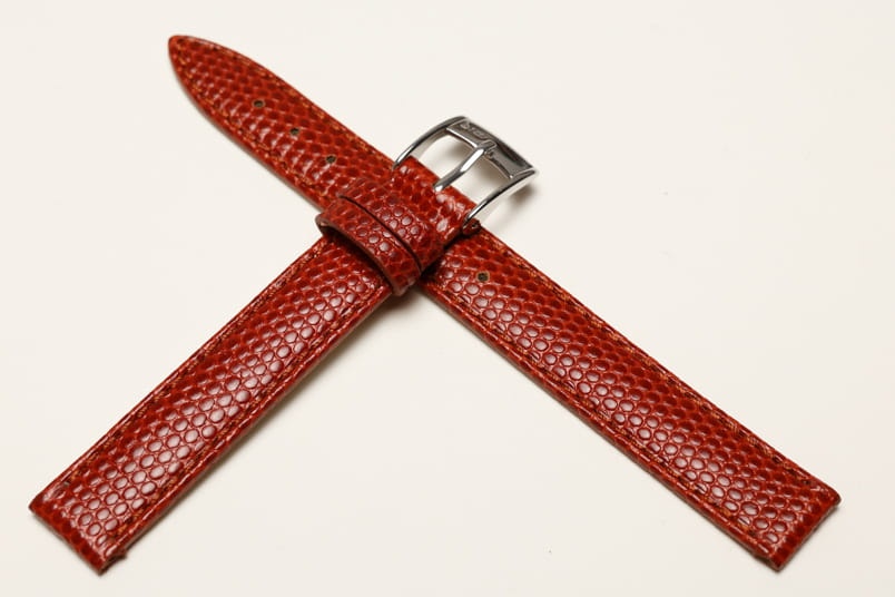 Wykonany ze skóry naturalnej na wzór skóry jaszczurki. Półmatowy. Obszyty nicią w kolorze paska. Podwójna szlufka. Stalowa klamerka. Grubość paska 3 mm.