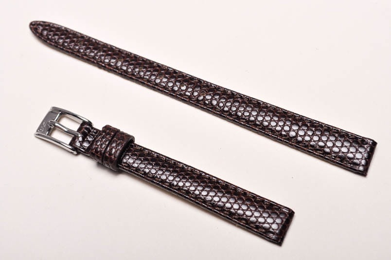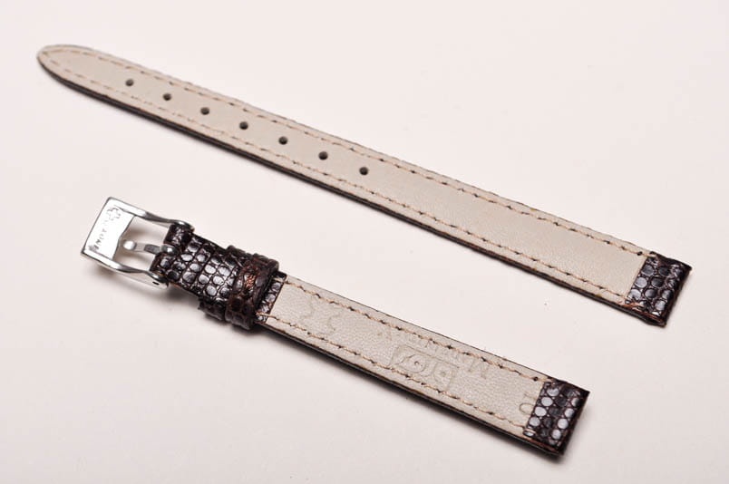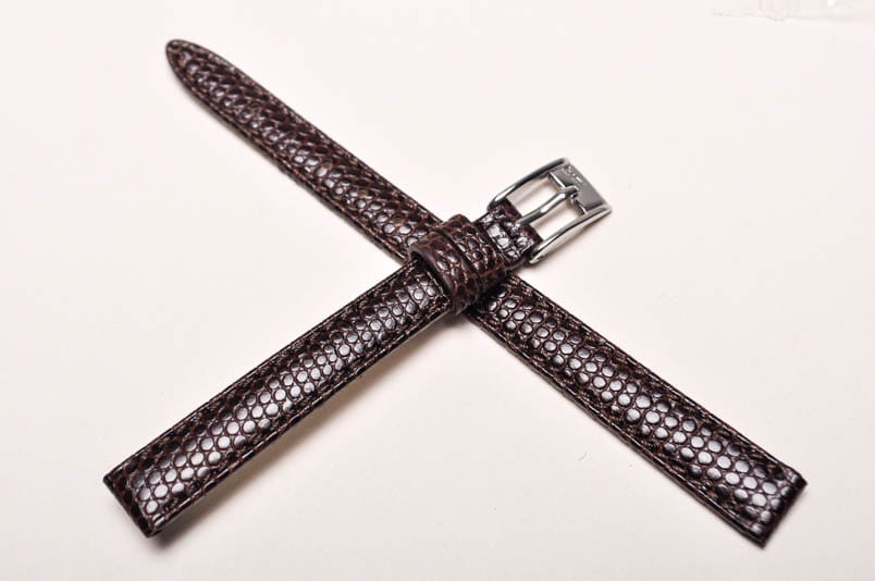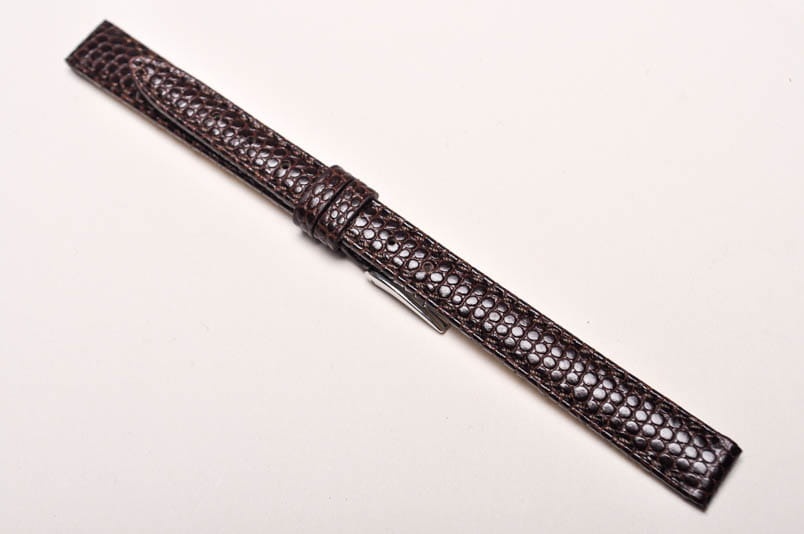 Wykonany ze skóry naturalnej na wzór skóry jaszczurki. Półmatowy. Obszyty nicią w kolorze paska. Podwójna szlufka. Stalowa klamerka. Grubość paska 3 mm.