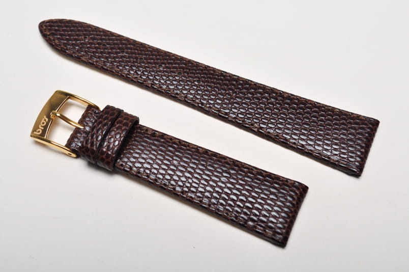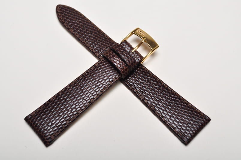 Wykonany ze skóry naturalnej na wzór skóry jaszczurki. Półmatowy. Obszyty brązową nicią. Klamerka 16 mm. Podwójna szlufka. Stalowa klamerka w kolorze złotym. Grubość paska 3 mm. Pasek do markowych zegarków, za rozsądną cenę, z możliwością wymiany klamerki na oryginalną.