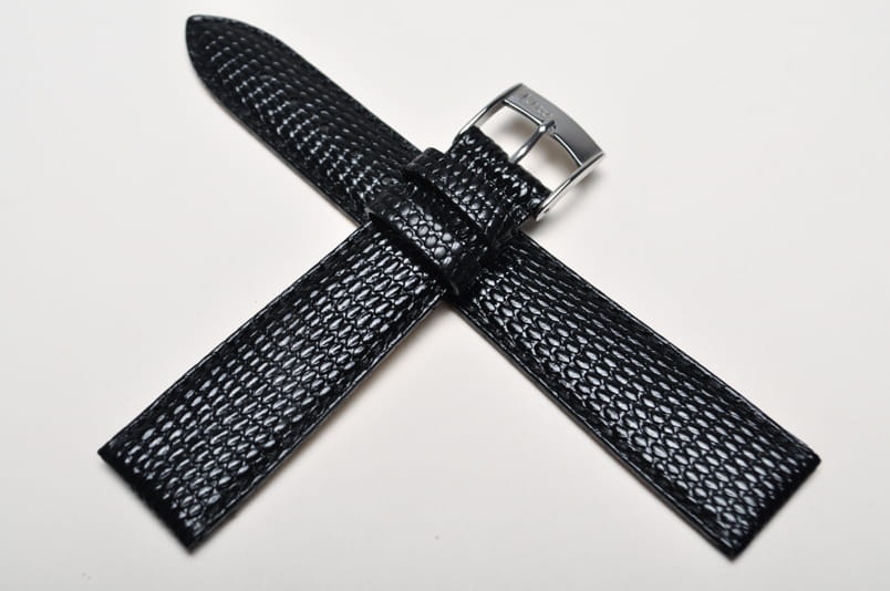 Uszyty z naturalnej skóry, imitacja skóry jaszczurki. W kolorze czarnym, matowy. Przeszyty nicią w kolorze paska. Podwójna szlufka, stalowa klamerka.