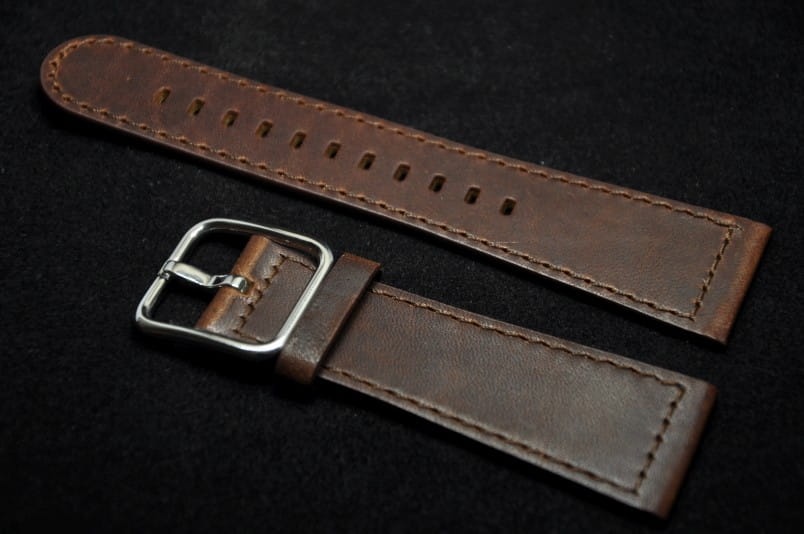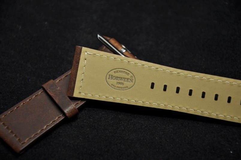 Pasek wykonany ze skóry cielęcej z garbarni Horween USA. Miękki i płaski, lico paska o matowym, naturalnym wykończeniu. Przeszyty nicią pod kolor paska. Stalowa klamerka o ciekawym kształcie z funkcją szlufki. Pojedyncza skórzana szlufka. Pasek idealnie pasuje do Apple Watch.