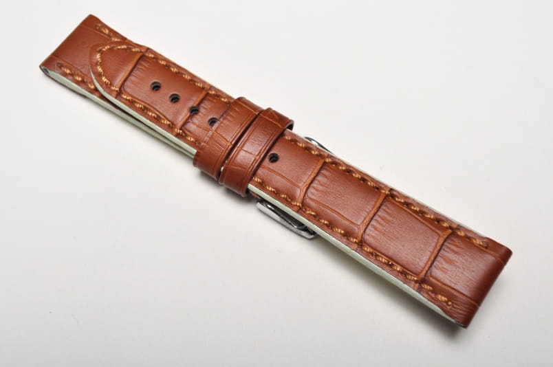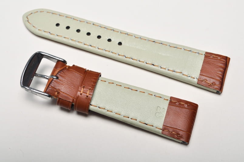 Wykonany ze skóry naturalnej. Spód i boki beżowe. Wierzch brązowy, imitacja skóry aligatora. Przeszyty brązową, grubą nicią. Dwie szlufki, stalowa klamerka.