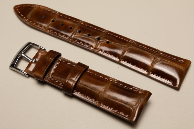 Pasek wykonany ze skóry cielęcej, wykończenie półpołysk. Nietypowy, ciekawy wzór dużych łusek skóry aligatora. Licowa, gładka futrówka pod kolor paska. Pogrubiany od 5,3mm przy mocowaniu, do 2,5mm grubości na końcu. Stosunkowo miękki. Przeszyty nicią pod kolor paska. Dwie szlufki, elegancka stalowa klamerka. Idealny jako zamiennik do markowych, klasycznych zegarków.