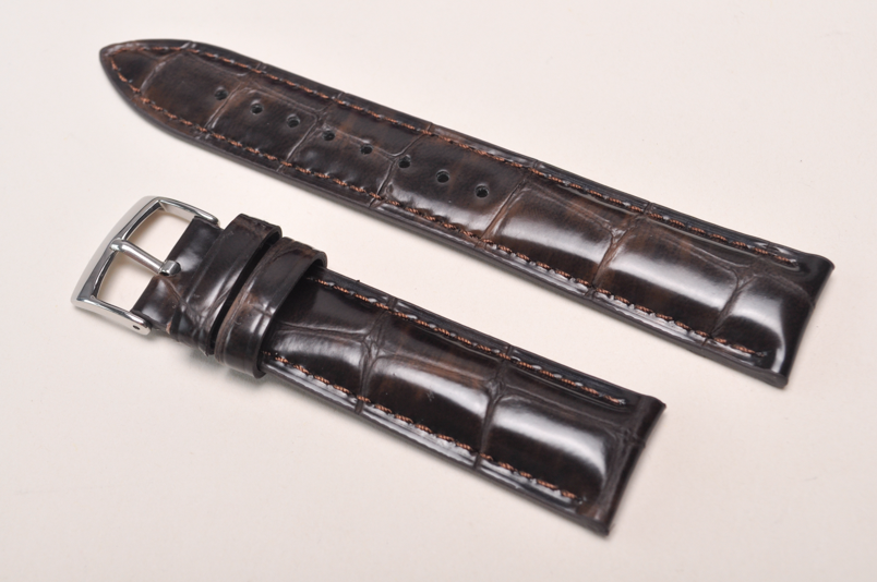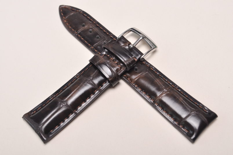 Pasek wykonany ze skóry cielęcej, wykończenie półpołysk. Nietypowy, ciekawy wzór dużych łusek skóry aligatora. Licowa, gładka futrówka pod kolor paska. Pogrubiany od 5,3mm przy mocowaniu, do 2,5mm grubości na końcu. Stosunkowo miękki. Przeszyty nicią pod kolor paska. Dwie szlufki, elegancka stalowa klamerka. Idealny jako zamiennik do markowych, klasycznych zegarków.