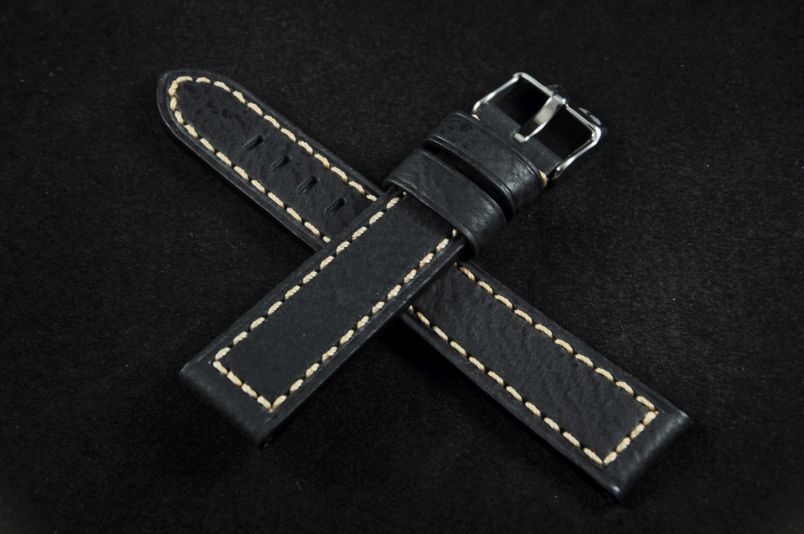 Pasek wykonany ze skóry naturalnej. 4mm grubości. Spód z materiału typu Lorica. Widoczna faktura skóry, matowy. Przeszyty grubą, jasną nicią. Miękki, dobrze układa się na ręku. Dwie szlufki, stalowa klamerka.