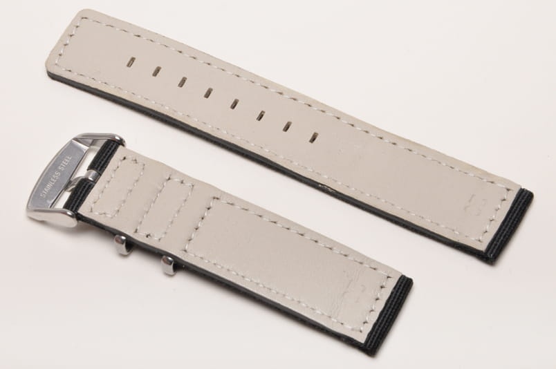 Pasek typu Nato, dwuczęściowy. Wykonany z nylonowego materiału, futrówka z licowej skóry. Obszyty nicią w kolorze paska. Stalowe, kwadratowe szlufki, stalowa klamerka mocowana na teleskop.