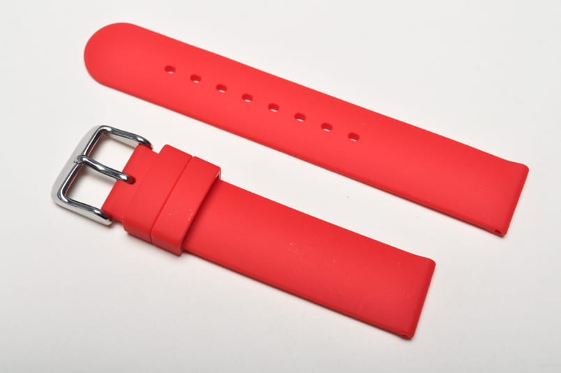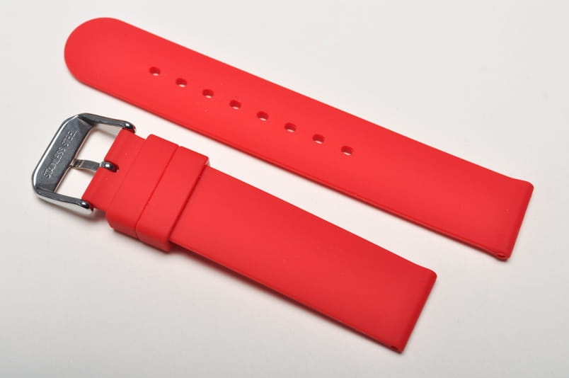 Wykonany z miękkiego silikonu, w jednolitym kolorze. Równoległy, gładki pasek. Dwie szlufki, stalowa klamerka.
