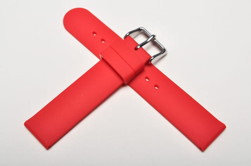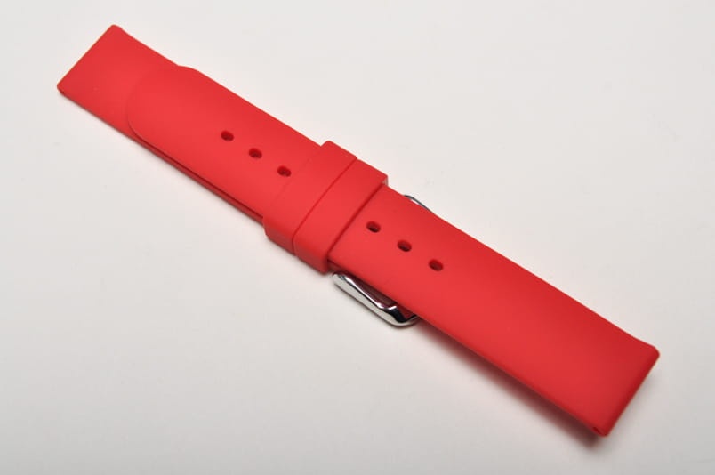 Wykonany z miękkiego silikonu, w jednolitym kolorze. Równoległy, gładki pasek. Dwie szlufki, stalowa klamerka.