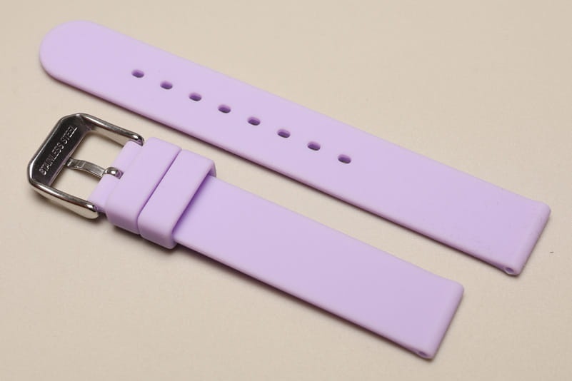 Wykonany z miękkiego silikonu, w jednolitym kolorze. Równoległy, gładki pasek. Dwie szlufki, stalowa klamerka.