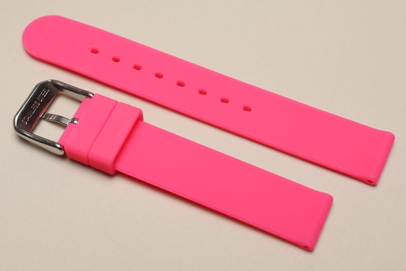 Wykonany z miękkiego silikonu, w jednolitym kolorze. Równoległy, gładki pasek. Dwie szlufki, stalowa klamerka.