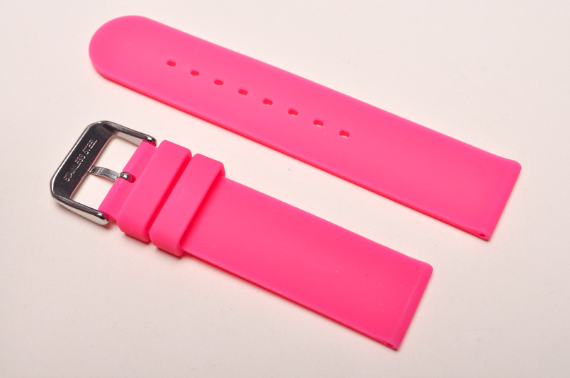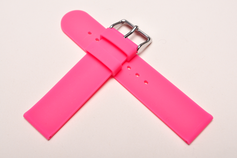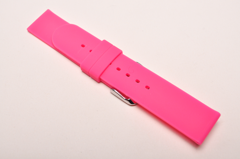 Wykonany z miękkiego silikonu, w jednolitym kolorze. Równoległy, gładki pasek. Dwie szlufki, stalowa klamerka.