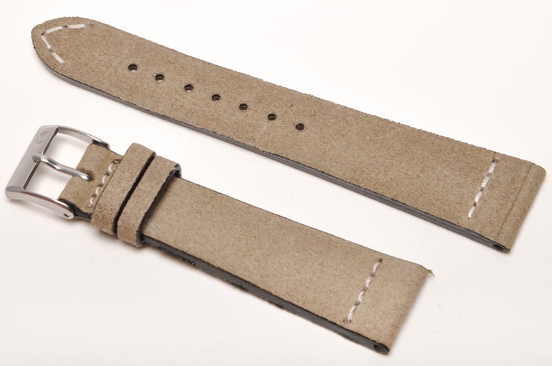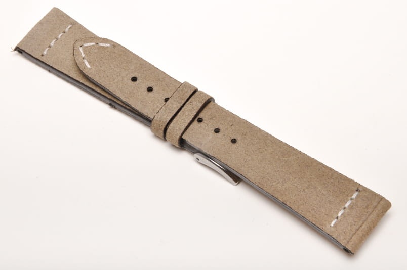 Wykonany z naturalnej, zamszowej skóry. Przeszyty na końcach ozdobnym, krótkim szwem. Delikatnie pogrubiany. Brzegi paska malowane. Dwie szlufki, stalowa klamerka. Dość miękki pasek w stylu Vintage.