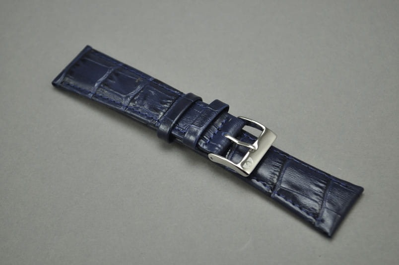Wykonany ze skóry naturalnej. Imitacja skóry aligatora, lakierowany. Przeszyty nicią w kolorze paska. Delikatnie pogrubiany od strony zegarka. Dwie szlufki, stalowa klamerka.