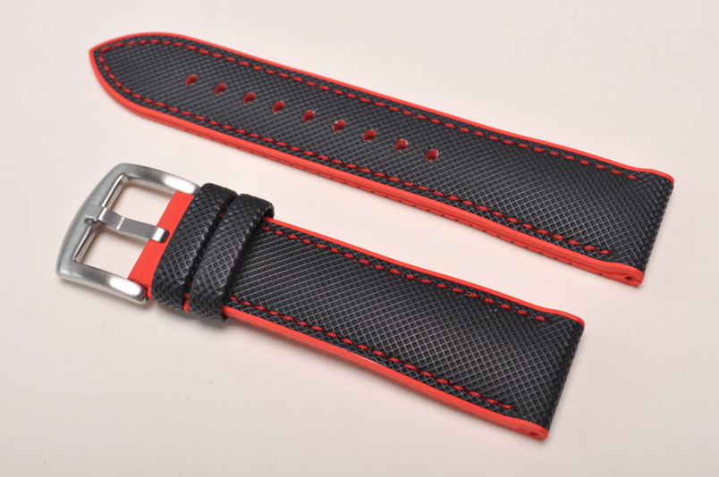 Spód wykonany z miękkiego kauczuku w jednolitym kolorze, profilowany w celu odprowadzenia wilgoci. Grubość paska od strony zegarka 5,7mm dalej do 3,0mm, Wierzch paska w kolorze czarnym ze wzorem drobnej kratki. Przeszycie wzdłuż w kolorze spodu. Dwie szlufki, stalowa, masywna klamerka. Wodoodporny.
