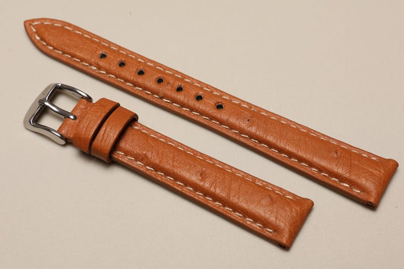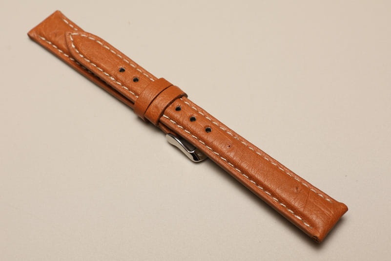 Pasek wykonany ze strusiej skóry. Futrówka z gładkiej licowej skóry. Widoczna faktura skóry, matowy i miękki. Przeszyty białą nicią. Ładnie układa się na ręku. Dwie szlufki, stalowa klamerka. Pasek do klasycznych, markowych zegarków, np. JLC Reverso.