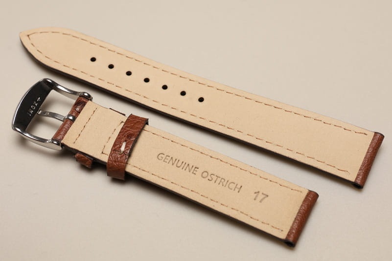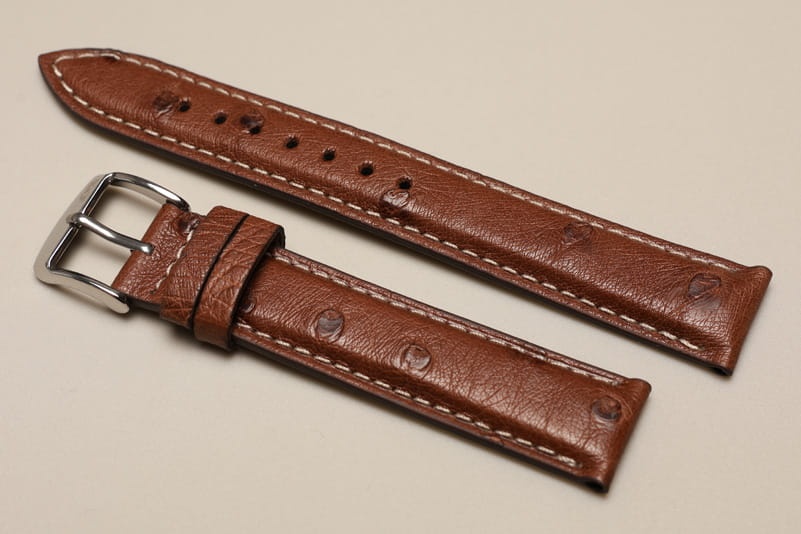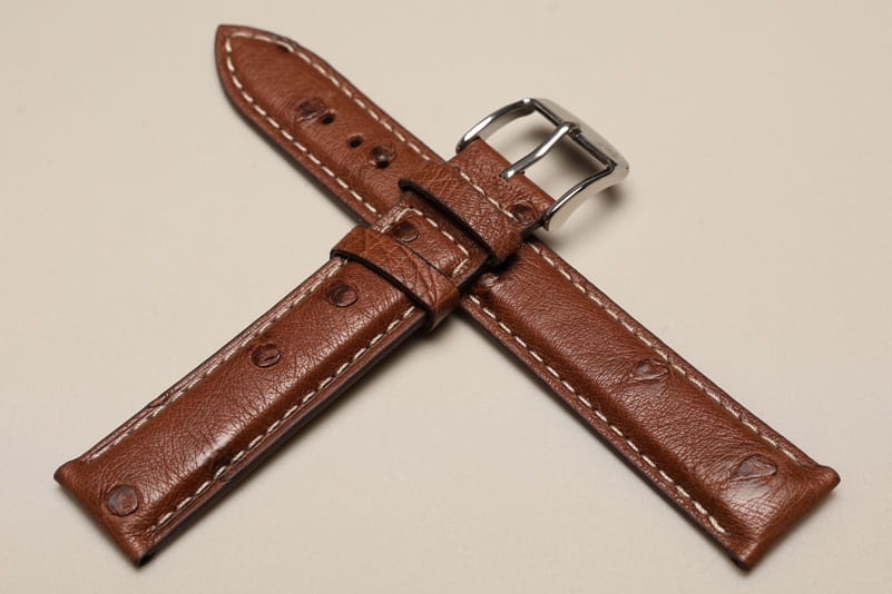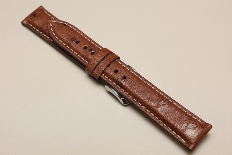 Pasek wykonany ze strusiej skóry. Futrówka z gładkiej licowej skóry. Widoczna faktura skóry, matowy. Przeszyty białą nicią. Ładnie układa się na ręku. Dwie szlufki, stalowa klamerka. Pasek do klasycznych, markowych zegarków.