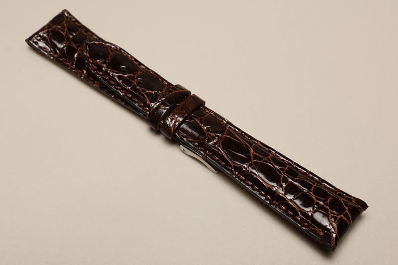Pasek wykonany ze oryginalnej skóry krokodyla. Wykończenie na wysoki połysk. Licowa, gładka futrówka. Pogrubiany do 4,4mm przy mocowaniu, dalej pasek ma 3,8mm grubości. Stosunkowo miękki. Przeszyty nicią pod kolor paska. Dwie szlufki, stalowa klamerka. Pasek do markowych, klasycznych zegarków.