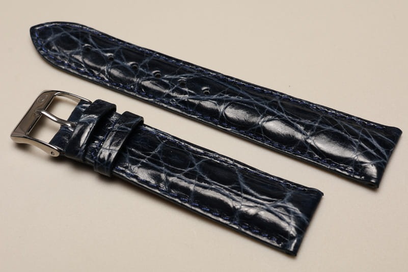 Pasek wykonany ze oryginalnej skóry krokodyla. Wykończenie na wysoki połysk. Licowa, gładka futrówka. Pogrubiany do 4,4mm przy mocowaniu, dalej pasek ma 3,8mm grubości. Stosunkowo miękki. Przeszyty nicią pod kolor paska. Dwie szlufki, stalowa klamerka. Pasek do markowych, klasycznych zegarków.