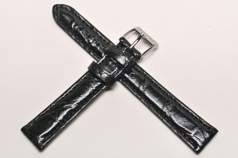 Pasek wykonany ze oryginalnej skóry krokodyla. Wykończenie na wysoki połysk. Licowa, gładka futrówka. Pogrubiany do 4,4mm przy mocowaniu, dalej pasek ma 3,8mm grubości. Przeszyty nicią pod kolor paska. Dwie szlufki, stalowa klamerka. Pasek do markowych, klasycznych zegarków.