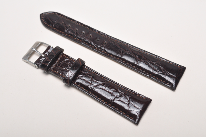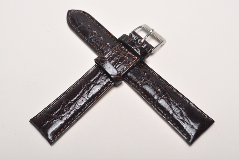 Pasek wykonany ze oryginalnej skóry krokodyla. Wykończenie na wysoki połysk. Licowa, gładka futrówka. Pogrubiany do 5mm przy mocowaniu, dalej pasek ma 3,8mm grubości. Stosunkowo miękki. Przeszyty nicią pod kolor paska. Dwie szlufki, stalowa klamerka. Pasek do markowych, klasycznych zegarków. Wersja XL