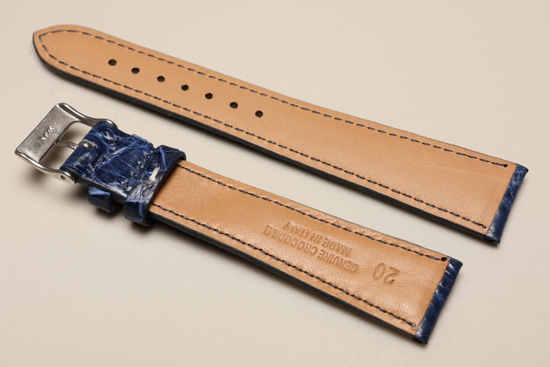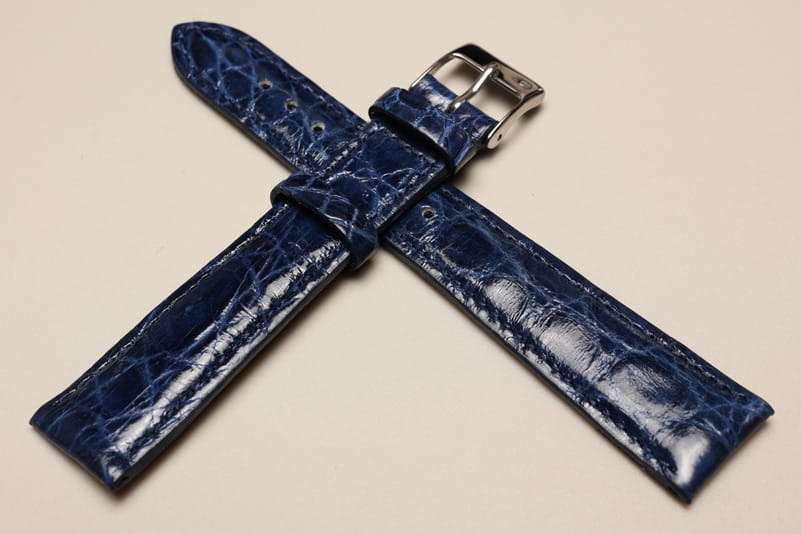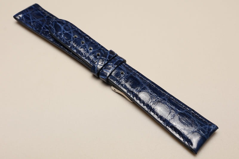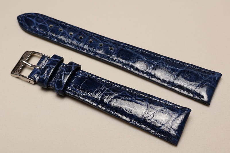 Pasek wykonany z oryginalnej skóry krokodyla. Wykończenie na wysoki połysk. Licowa, gładka futrówka. Pogrubiany do 5mm przy mocowaniu, dalej pasek ma 3,8mm grubości. Stosunkowo miękki. Przeszyty nicią pod kolor paska. Dwie szlufki, stalowa klamerka. Pasek do markowych, klasycznych zegarków. Wersja XL
