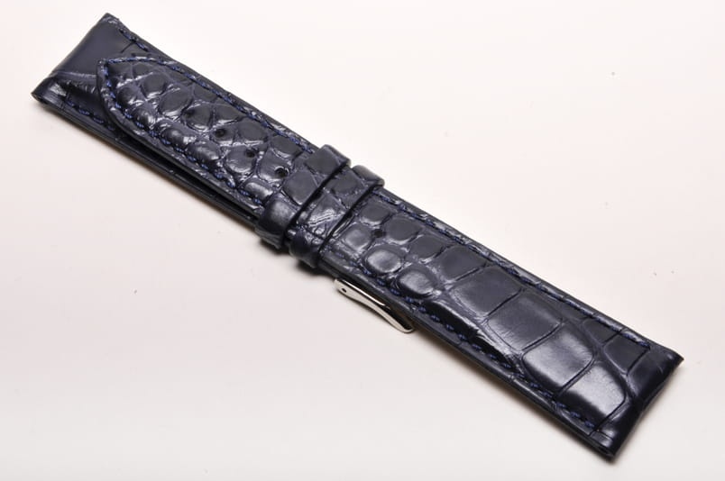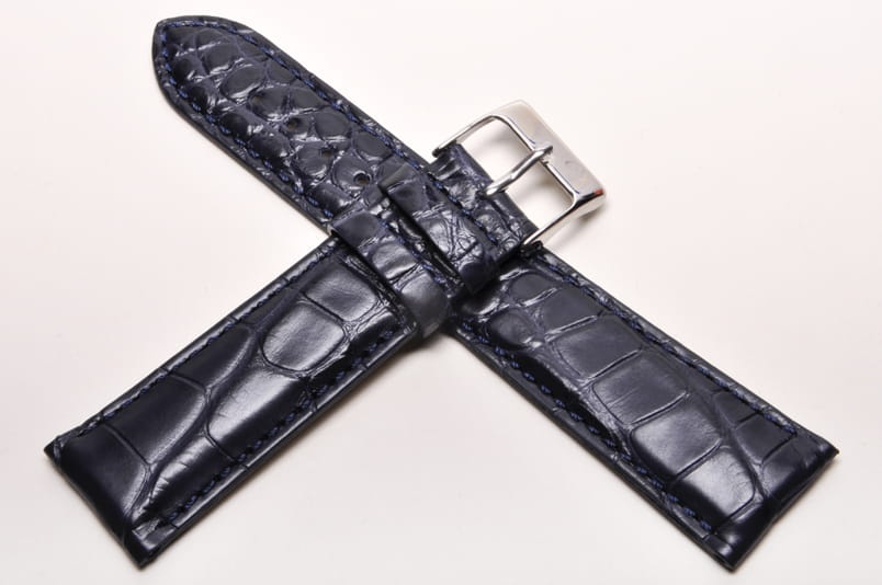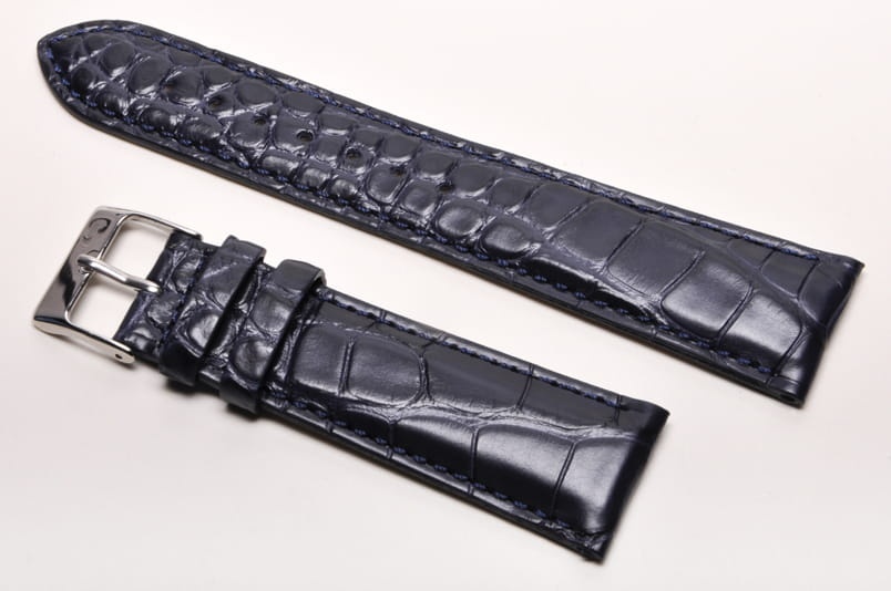 Pasek wykonany ze oryginalnej skóry aligatora. Duże, owalne łuski. Wykończenie półmatowe. Licowa, gładka futrówka. Pogrubiany do 4.5mm przy mocowaniu, dalej pasek ma 3,5mm grubości. Stosunkowo miękki. Przeszyty nicią pod kolor paska. Dwie szlufki, stalowa klamerka. Pasek do markowych, klasycznych zegarków.